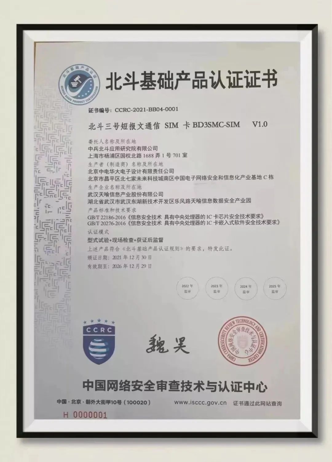 北斗院短報文平臺北斗三號短報文通信SIM卡率先通過中國網絡安全審查技術與認證中心認證,獲頒北斗基礎產品認證001號證書。該產品為面向北斗短報文通信終端入網認證應用的SIM卡產品,支持北斗衛星導航系統民用短報文終端進行接入北斗網絡的用戶身份鑒權認證和信息加解密功能,包含芯片和片內操作系統(COS)。